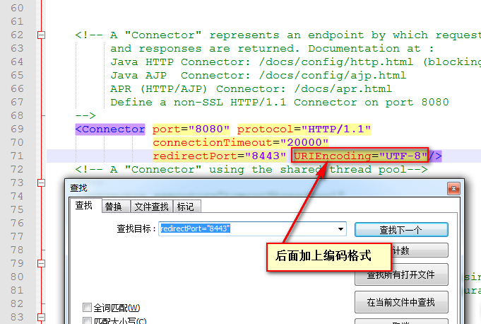 <Connector port="8080" protocol="HTTP/1.1" connectionTimeout="20000" redirectPort="8443" URIEncoding="UTF-8" />