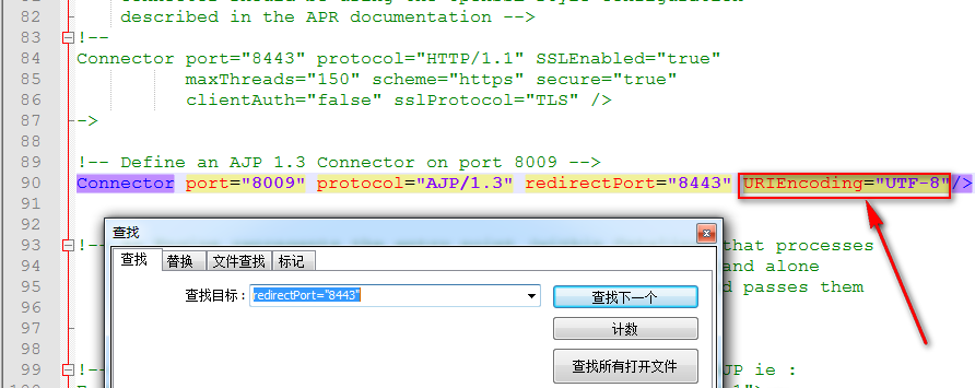 <Connector port="8009" protocol="AJP/1.3" redirectPort="8443" URIEncoding="UTF-8" />